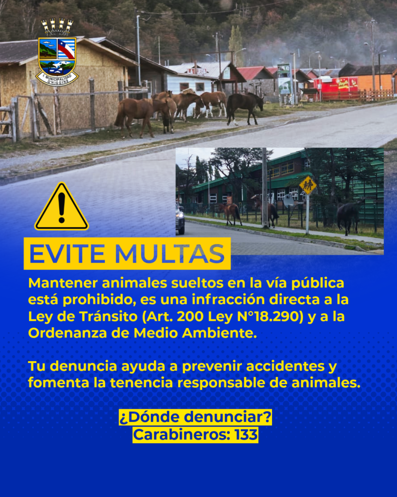 La Ilustre Municipalidad de O’Higgins, informa a la comunidad que se intensificarán los controles preventivos respecto al tránsito de animales domésticos y de producción por las calles y rutas de la comuna.
